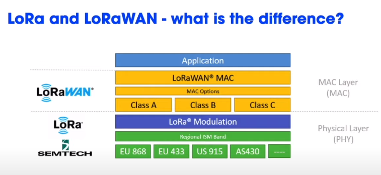 LoRa使用免授权的sub-GHz无线频段,比如433 MHz,868 MHz(欧洲)以及915 MHz(北美)。它允许长距离传输(郊区10km+,城区至2km),并且还可以维持极低的功耗(sub uA)。该技术的表达方式 包括两种:LoRa,物理层;LoRaWAN (Long Range Wide Area Network),上层。